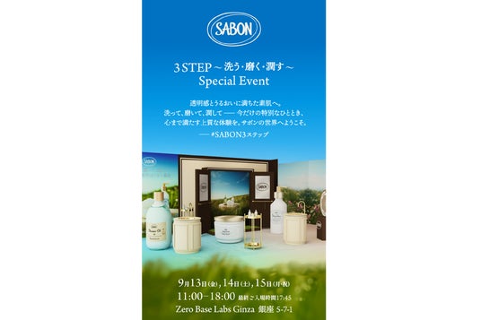 ナチュラルコスメブランドSABON(サボン)は、”洗う、磨く、潤す”の3 STEPで美しい素肌を叶える「3 STEP Ritual」をテーマとしたプロモーションの一環として、2025年9月13日(土)より特別イベント「SABON 3 STEP ~洗う・磨く・潤す~ Special Event」を、東京都中央区銀座にて開催いたします。
