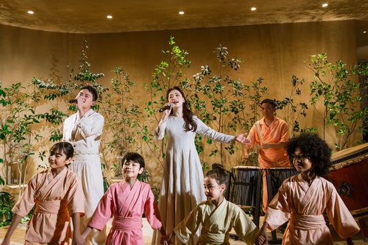夕暮れ時には、会場をパビリオンの外へ移し、夕陽を眺めながら大屋根リングを歩く「TOMONI ウォーク」を実施。参加者は、それぞれの願いを込めた提灯を手に、未来への思いを胸に歩を進めました。夜のカクテル レセプションは、伝統的な和楽器の演奏ではじまり、日本人アーティストの里アンナと子供たちによる、オリジナルソング「Ai no Iro」の演奏が続きました。そして1970年大阪万博で初めて「霧の彫刻」を発表した中谷芙二子がダンサーの平井優子とともに「Fog-Live:Yoin (余韻)」を披露。ダンス、音楽、そして霧が即興で織りなす一夜限りの作品が、人々を魅了し、イベントのフィナーレを飾りました。