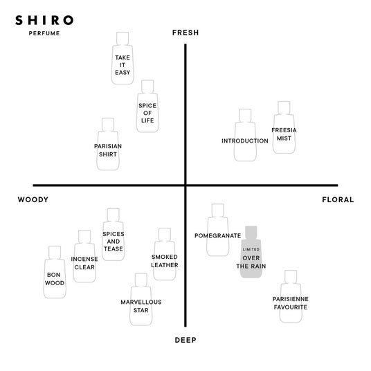 「OVER THE RAIN」はPARISIENNE FAVOURITEよりもフレッシュで、INTRODUCTIONよりもフローラルです。ジェンダーニュートラルな香りなので、SHIRO PERFUMEのPARISIAN SHIRTがお好きな方にもおすすめです。