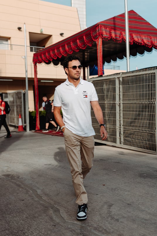 キャデラック・フォーミュラ1(R)チーム ドライバーでありグローバル・メンズウェア・アンバサダーのチェコ・ペレスは、トミー ヒルフィガー×キャデラック・フォーミュラ1(R)チーム ファンウェアコレクションより、ホワイトのポロシャツを着用し、ベージュのデントンチノ(トミー ヒルフィガーSpring 2026 コレクション)を合わせています。