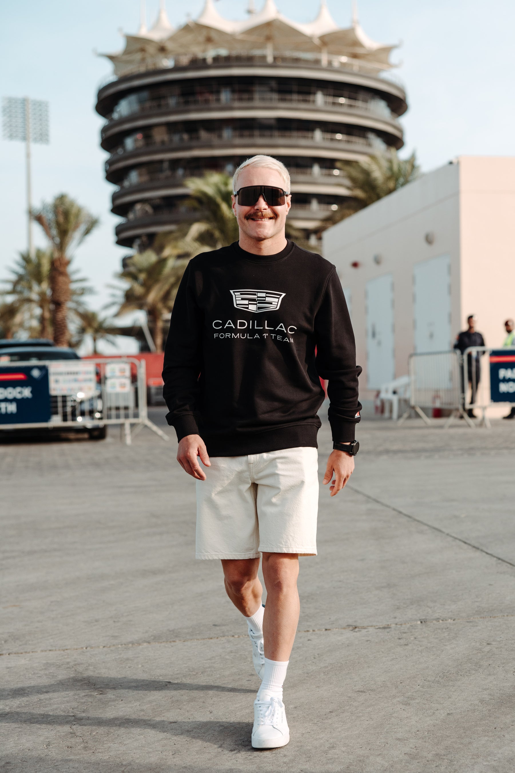 キャデラック・フォーミュラ1(R)チームドライバーのバルテリ・ボッタスは、トミー ヒルフィガー×キャデラック・フォーミュラ1(R)チーム ファンウェアコレクションより、ブラックのTシャツとクルーネックスウェットを重ね、トミー ヒルフィガー Spring 2026 コレクションのホワイトのドーバーショーツとホワイトスニーカーを合わせています。