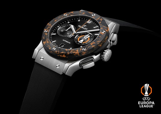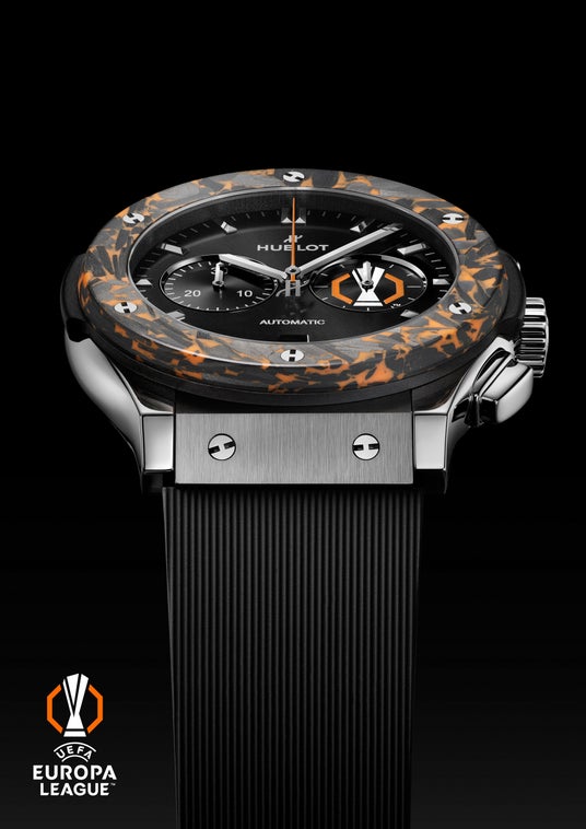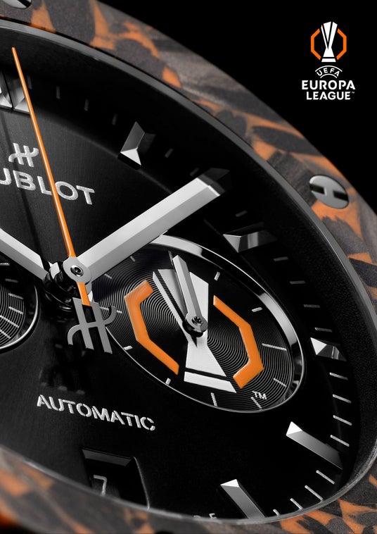 ウブロは、UEFAヨーロッパリーグ公式ウォッチとして「クラシック・フュージョン クロノグラフ UEFA ヨーロッパリーグ チタニウム カーボン」を発表しました。世界限定50本のこの時計は、UEFAヨーロッパリーグのシンボルカラーであるブラックとオレンジを忠実に再現しています。オレンジのグラスファイバーを組み合わせたカーボンファイバー製ベゼルは、ブラックからアンスラサイトグレーへと移り変わるグラデーションを見せています。そして、ウブロの象徴的な6つのH型のチタニウム製ビスで装飾されています。カーボンファイバーとファイバーグラスの模様は常にランダムであり、それぞれが真に唯一無二の存在となっています。