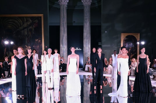 到着したゲストを迎えたのは、メゾンのモンテナポレオーネを象徴するシグネチャーカラーを想起させる、赤く輝くスレッドのインスタレーションです。中庭には、揺らめくキャンドルの道が続き、ゲストをブレラの芸術の中心へと導きました。Sale Napoleoniche(ナポレオンの間)は今回初めて暖かな雰囲気のランウェイへと姿を変え、18人のモデルがハイジュエリーを披露しました。訪れた人々は、チェーンが彫刻へと昇華し、ボリュームが常識を覆し、色彩が思いがけない調和の中で舞う様子を間近で体感しました。
