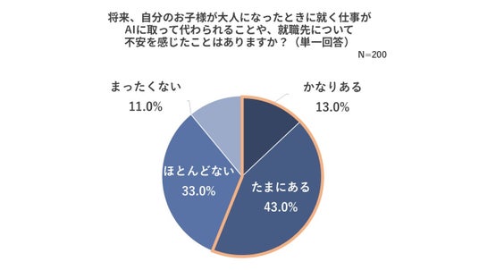 続いて、将来、自分のお子様が大人になったときに就く仕事がAIに取って代わられることや、就職先について不安を感じたことはあるかを聞いたところ、「かなりある」と「たまにある」を合わせると56.0%となり、半数以上に達しました。 あらゆるメディアでAIに奪われる仕事とそうでない仕事に関する情報が飛び交う昨今、自分のお子様の将来を心配する親御さんの心情が明らかになりました。