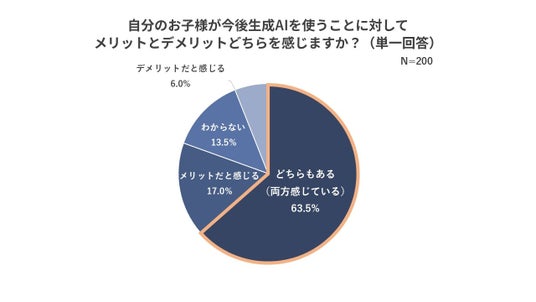- 自分の子どもが今後生成AIを使うことに対しては、6割の親が「メリットとデメリット両方感じる」と回答。