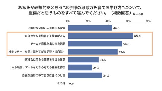 親が理想的だと思う”子どもの思考力を育てる学び方”は「自分の考えを発表する機会がある」が最多。次いで「チームで意見を出し合う活動」「好きなテーマを深く掘り下げる学習」