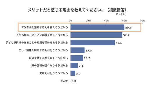 メリットと回答した理由は「デジタルを活用する力を養えそうだから」が最多、デメリットと回答した理由は「自分で考える 力や思考力が低下しそうだから」が最多という結果に。