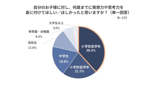 続いて、AIが普及する時代だからこそお子様に発想力や思考力を身に付けてほしいと思うかを聞いたところ、「とても思う」「少し思う」を合わせると86.0%の人が身に付けてほしいと考えていることがわかりました。さらに、 「とても思う」「少し思う」と回答した方に自分のお子様に対し、何歳までに発想力や思考力を身に付けてほしい(ほしかった)と思うかを聞いたところ、「小学校高学年まで」が最も多く、38.4%となりました。