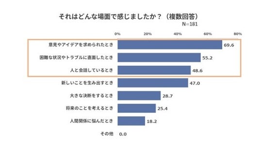 特に感じた場面は「意見やアイデアを求められたとき」が多く7割近くという結果に。