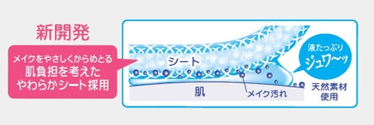 メイク落とし機能はそのままに、肌の上をもっとなめらかにすべるやわらか新シートを採用しました。美容液たっぷりのクレンジング液がじゅわーっと毛穴や肌のキメにいきわたり、サッとふきとるだけでメイクをスッキリ落とします。