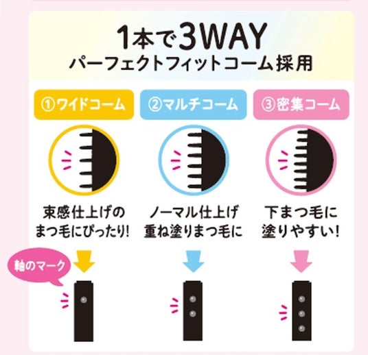 1本で3WAYのパーフェクトフィットコーム採用。まつ毛美容液成分※3配合で、傷みが気になるまつ毛にも使えます。 アルコール※6フリー・パラベンフリー
