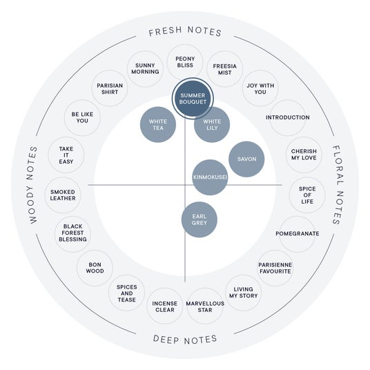みずみずしく明るいベルガモットと、すっきりとしたピンクペッパーが爽やかに香るトップノートから、優雅なローズを中心に、甘いマグノリアと可憐なミュゲを束ねたミドルノートへ。ラストは、ムスクとサンダルウッドがやさしく全体を包み込み、穏やかな余韻を残します。