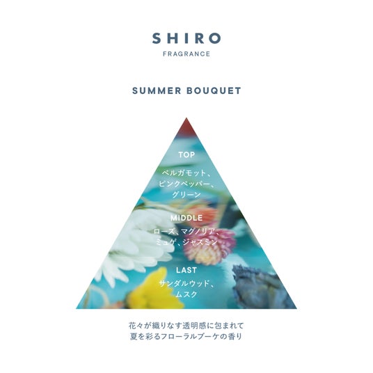 澄んだ青空と、やわらかな風、そしてまばゆい光を浴びて咲き誇る花々。SHIROらしく夏のフローラルを束ねた「サマーブーケ」の香りに包まれて、心はずむ太陽の季節を、清々しくお過ごしください。