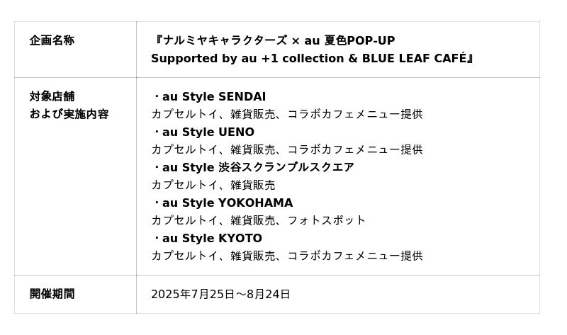 株式会社ナルミヤ・インターナショナル(本社:東京都港区、代表取締役執行役員社長:國京紘宇)は、KDDI株式会社(本社:東京都港区、代表取締役社長 CEO:松田 浩路)の運営する全国5都市(仙台、上野、渋谷、横浜、京都)のKDDI直営店にて、2025年7月25日から8月24日の期間、当社が展開するジュニアアパレルブランドのキャラクター『ナルミヤキャラクターズ』のポップアップイベント(以下、本イベント)を開催します。