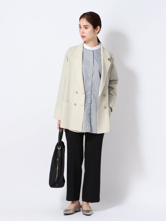 ジャケットの袖は、二の腕が隠れる絶妙な長さに調整し、気になる腕周りを隠すことができる仕様にしました。さらに袖口を広くすることで、腕がすっきりと見え、お客様が潜在的に抱えている半袖にありがちな悩みを解消する工夫も施しています。また、ウエストラインは控えめに絞り、着丈をヒップ周りが隠れる長さに調整するなど、体型カバーできる設計にしている他、ビジネスシーンでも使いやすいテーラードジャケットを企画したことできちんと感を演出しました。商談や出張などでジャケットが必要な場面でもカジュアル見えしすぎず上品に着用できます。