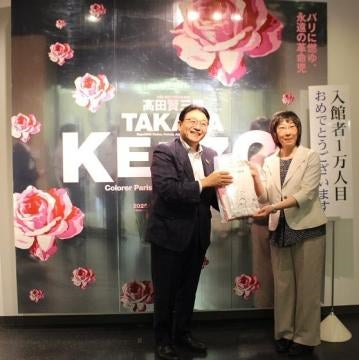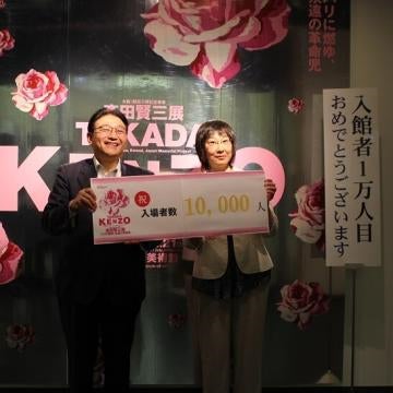 令和7年6月7日(土)の午後2時30分頃に、特別企画展「高田賢三展 パリに燃ゆ、永遠の革命児」の入場者数が1万人を突破しました。記念すべき1万人目の入場者には、清元秀泰市長より記念品が贈呈されました。