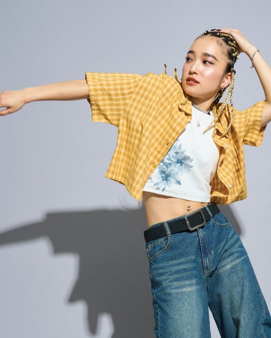 チェックシャツは短丈タイプなので1枚で着こなしてもスタイルが良く見えます。
