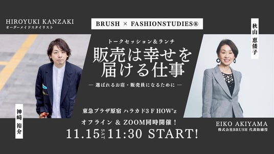 株式会社 BRUSH(ブラッシュ、以下BRUSH / 本社:東京都渋谷区、代表取締役 秋山倭恵子) は、ファッションを体系的に学ぶ様々な講座を企画運営するFashionStudies(R)との共催により、選ばれる店・販売員になるヒントを探るトークセッションを2025年11月15日(土)に開催いたします(オフライン/オンライン開催)。