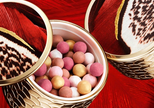 コレクションのためにデザインされた〈ルージュ ジェ〉のケースとパーフェクトに調和するゴールドのケース。蓋にはフェニックスの華麗な羽をイメージした、鮮やかな赤にベージュを組み合わせたプリントが施され、ゴールドのアクセントが添えられています。ケースの中に収められているのは、パウダーのパールが渾然一体となった新たなハーモニー。生き生きとしたトーンを携えた2つの新シェード、マゼンタピンクとヌードベージュが、ほのかに染まった頬のような自然な輝きを演出します。