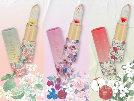 粧美堂のコスメブランド『Meica(メイカ)』のフラワーモイストリップは、唇に香りをまとわせながら濃厚に保湿してくれるクリアタイプのリップです。ラインナップは、前回に引き続き「アップル&ジャスミンの香り」に加え、新たに「ベルガモット&ジャスミンの香り」と「ベリー&ローズの香り」が登場。お花と金箔を閉じ込めた見た目のかわいさと、スクワラン配合※1でしっとり潤う唇へ導く、実用性にも優れたアイテムです。