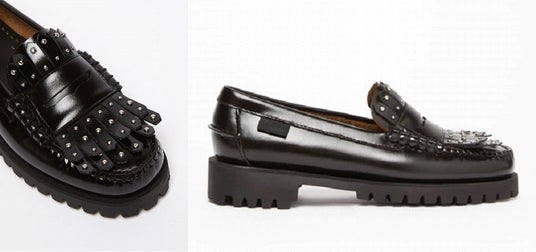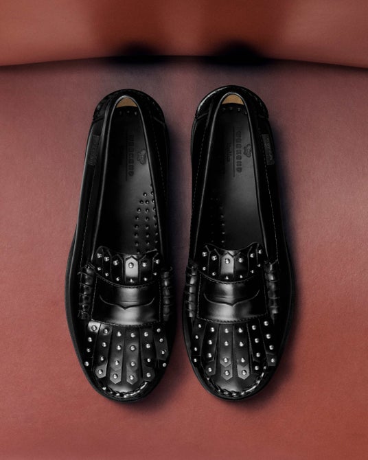 本コレクションの特徴は、フリンジ部分にあしらわれたマイクロサイズのシルバースタッズ。グラフィカルに並んだスタッズがプレッピーとパンクの融合を想起させ、個性を際立たせます。さらに、耐久性に優れたラグソールとブラックブラッシュドカーフスキンを組み合わせた端正なフォルムが、洗練された存在感を放ちます。