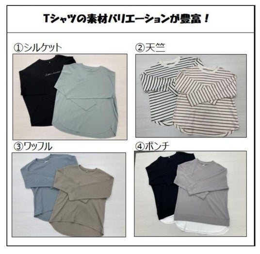 ●ヘビロテTシャツアメリカ綿を使用し、光沢感がありキレイめなポンチ素材、デイリー使いに適した天竺素材、1枚でもサマになる、カジュアルなワッフル素材を展開します。