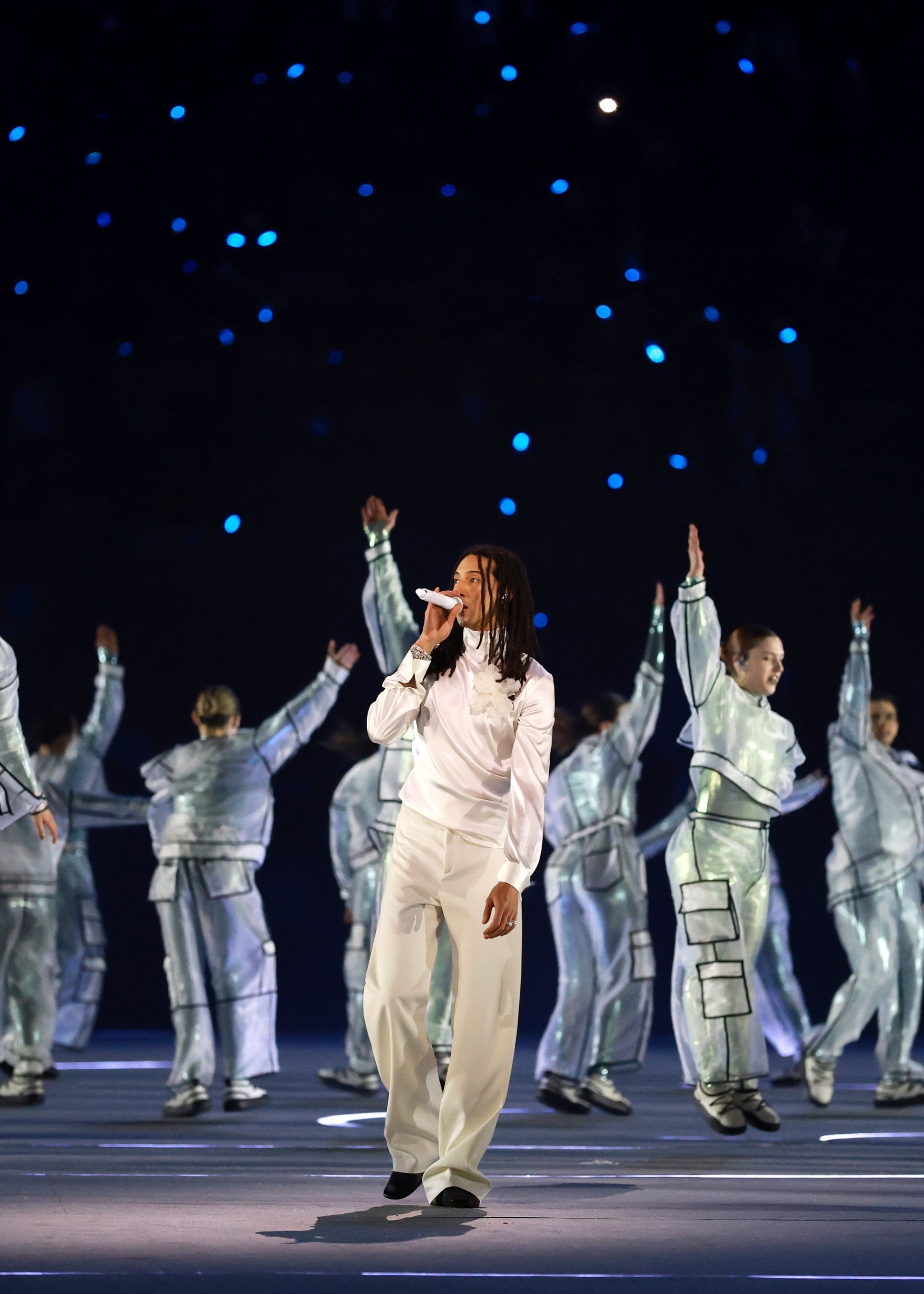 ラッパーのガリ(Ghali)は、2月6日にイタリア・ミラノのサン・シーロ スタジアムで行われた「ミラノ・コルティナ 2026 冬季オリンピック」開会式にて、グッチのカスタムルックを着用して登場。トーン オン トーンの光沢あるフラワーブローチをあしらった、オールホワイトのシルク ハイネックシャツに、サテンのサイドバンドが施されたウールパンツを合わせ、「La Famiglia」コレクションのブラックレザー ホースビット ローファーを着用しました。