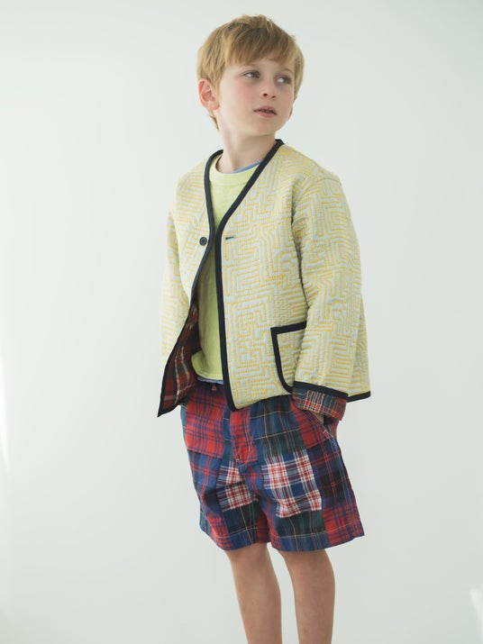 今回登場する別注ジャケットは、ブランドの過去の人気アイテムから特別にキッズ Exclusiveアイテムとして復刻していただいたスペシャルアイテム。アフリカのプリミティブな模様から着想を得た柄を構築した目を惹く刺繍ジャケットです。太めの糸で大胆にデザインを施し、中に中綿を入れることで立体的なフォルムに仕上げたキルトジャケットを今回新たにロンハーマンキッズだけのカラーリングでリバイバルしました。リバーシブルにも着用可能で、裏面の生地はインド綿のチェック柄を使用し、パイピングは裏のチェックからリンクさせた配色のデザインに仕上げました。