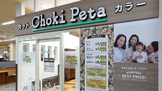 チョキペタは「ちょっと髪が伸びてきた」「白髪が気になる」というときに便利な、カットとカラーのメンテナンス専門店です。お気に入りの髪型をキープするのに便利で、お客様の7割を40代~60代の女性が占めています。料金は、カット1,540円、前髪カット550円、すぐに伸びてしまう白髪の根元染めは根元から2cmまで2,750円、全体のカラーは3,850円~とお手頃な料金設定です。施術後は、セルフブローブースで、自分で髪を乾かしたり、スタイリング剤などを自由に使用できます。スーパー内の一角など、買い物ついでに立ち寄りやすい立地に出店し、関東圏と関西圏に76店舗(※)を展開しています。