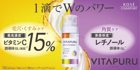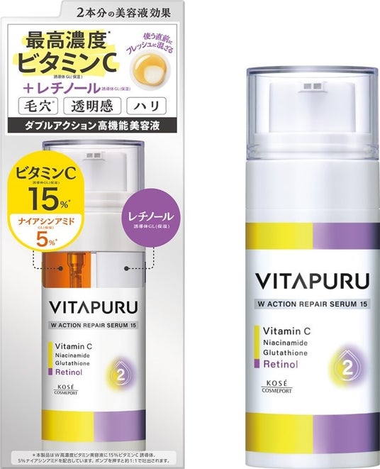 コーセーコスメポート株式会社(本社:東京都中央区、代表取締役社長:小林 孝雄)は、あらゆる肌悩みの原因にアプローチしすこやかな透明美肌へ導くスキンケアブランド『VITAPURU(ビタプル)』(以下『ビタプル』)より、「毛穴」「透明感」「ハリ」をケアする「ダブルアクション リペアセラム 15」(1品目1品種、ノープリントプライス)を2025年7月22日より全国の量販店・ドラッグストアを中心に発売します。