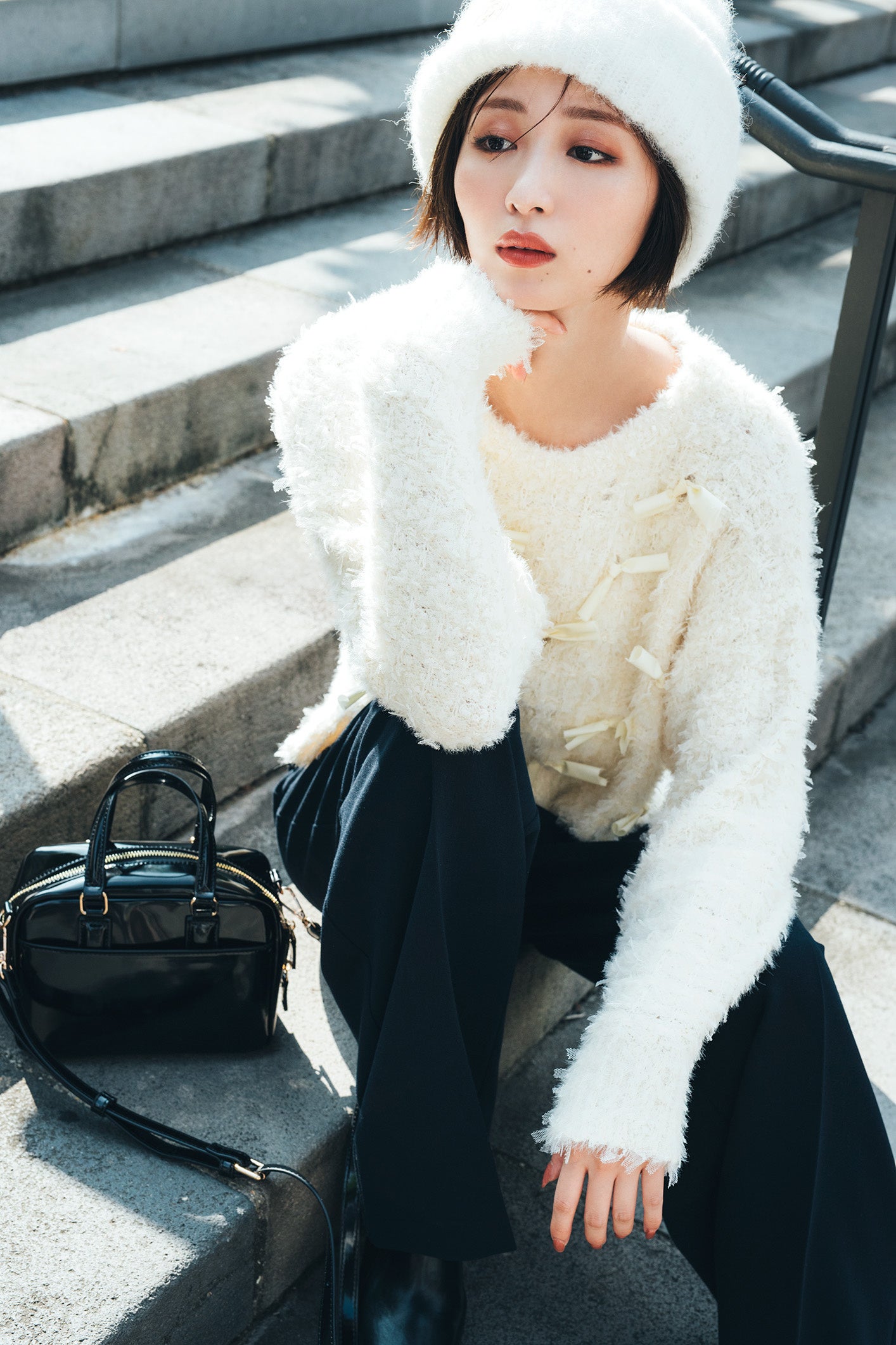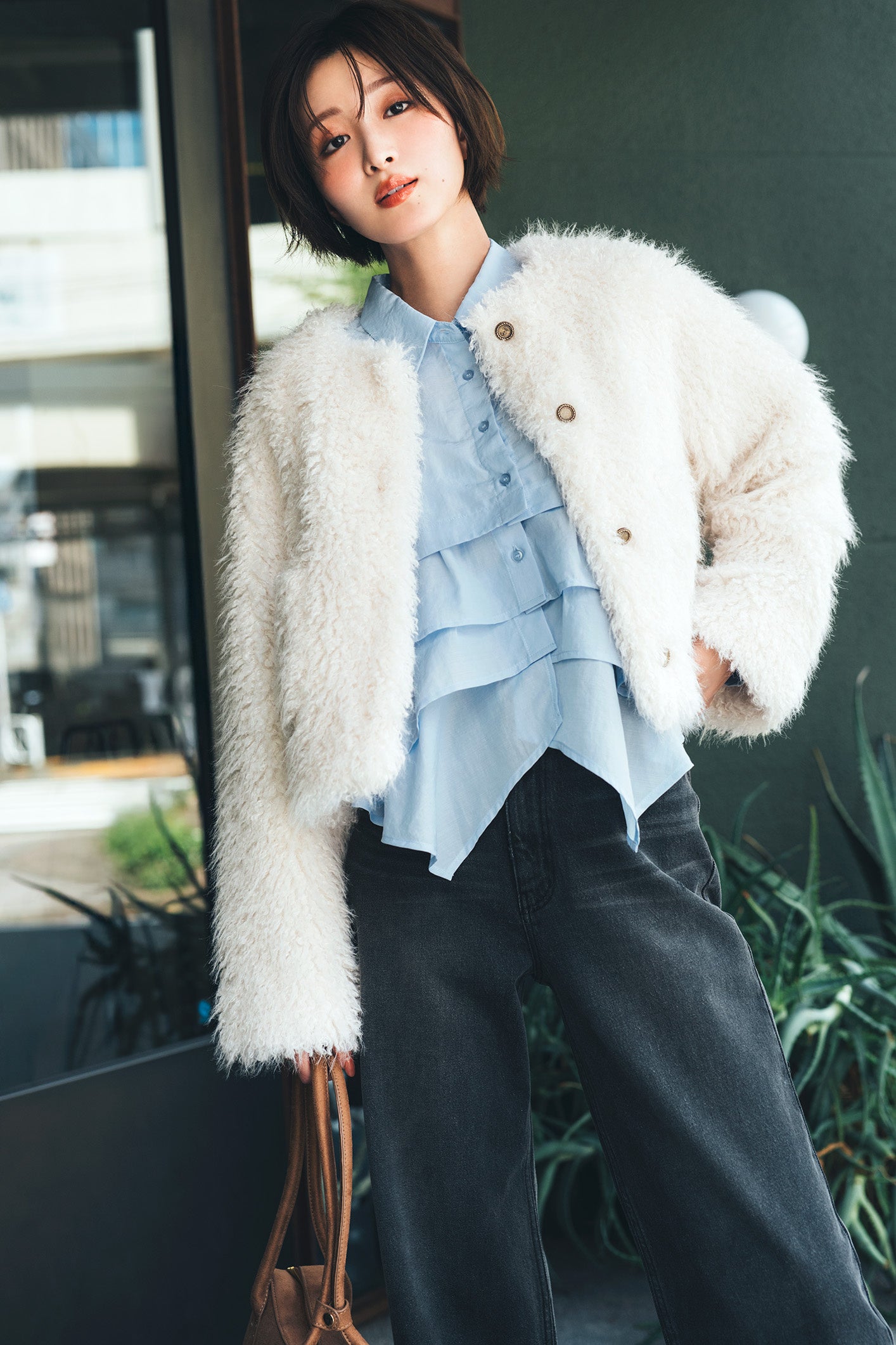 ふわもこ質感や華やかなエッセンスを加え、モードなスタイルにロマンティックなムードを添える