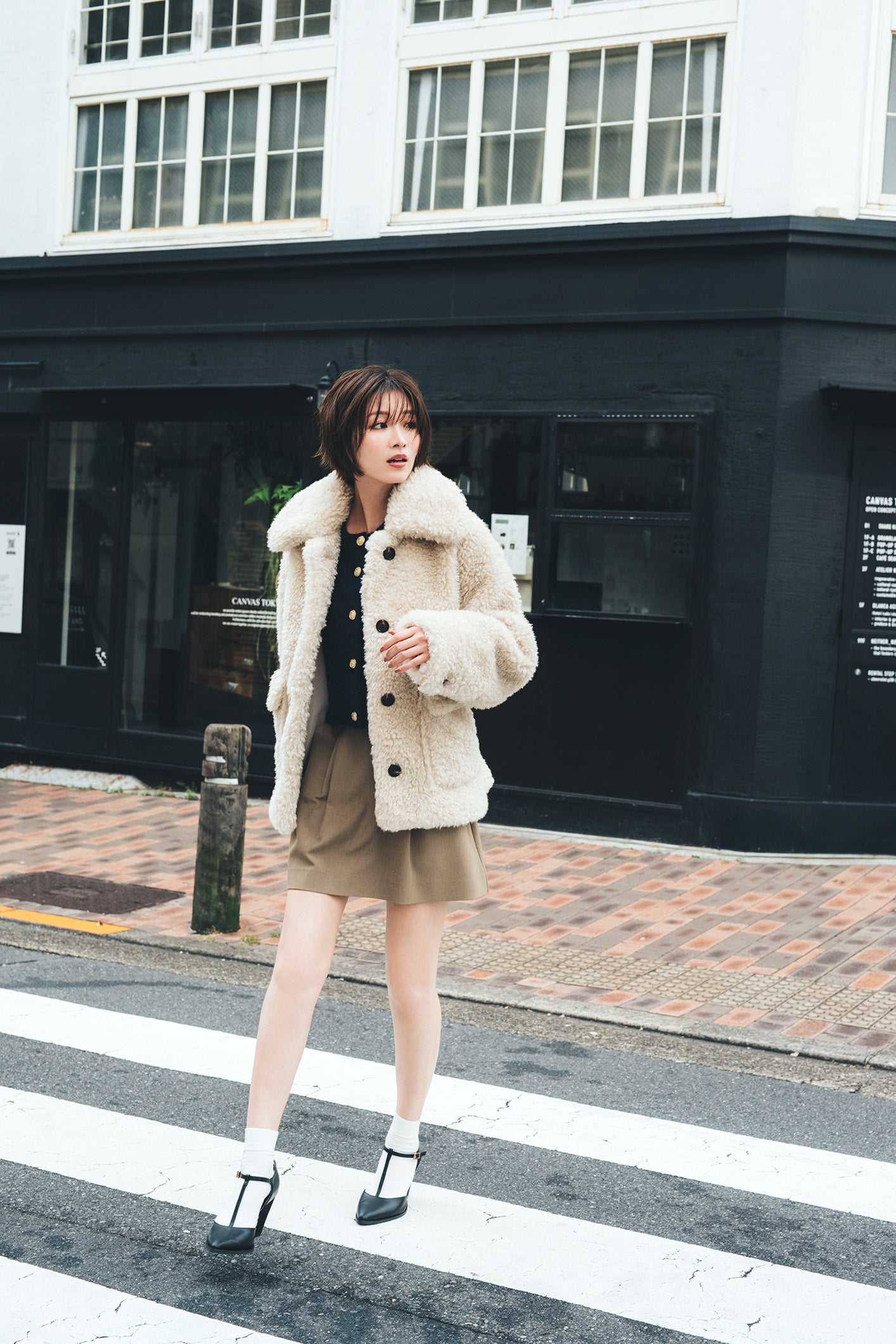 OUTER ¥25,300 / KNIT CARDIGAN ¥14,300 / SKIRT ¥10,450