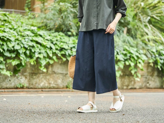 ワイドギャザーパンツは全体的にゆったりとしており、風通しが良いのがポイントです。コクーンギャザーパンツより少しだけ長めで、サイズもM、Lの2サイズご用意しています。