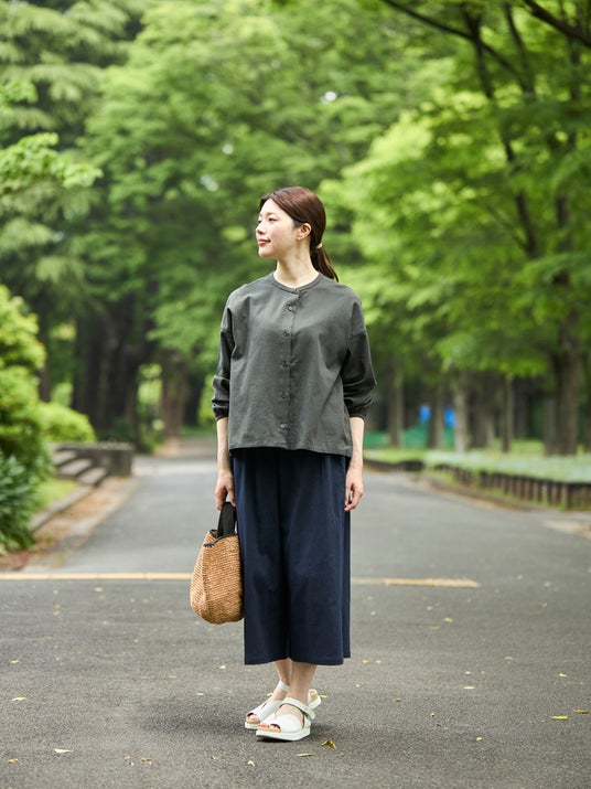 ボタン付きの長袖ブラウスは、袖口の一部にゴムが入っているので、お好みの袖丈に調整できます。二の腕まわりや身幅がゆったりとしているので、腕回りや胴まわりに締め付け感がなく、肉感を拾わず、着やせして見えます。