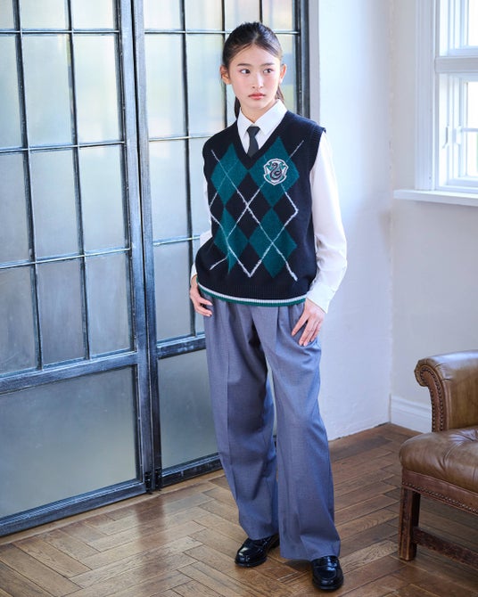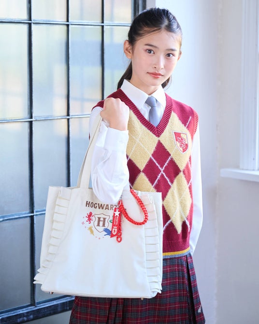 今回のコレクションでは、ホグワーツの「4つの寮」のエンブレムモチーフとカラーバリエーションを取り入れたニットベストやストラップなど、ホグワーツ魔法魔術学校の生徒気分を味わえる、ときめくアイテムを展開。作品の世界感をポンポネット ジュニアらしい清楚で上品なスクール風デザインに仕上げました。