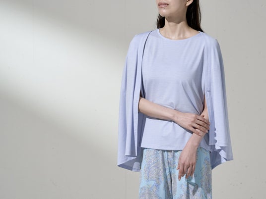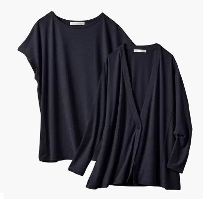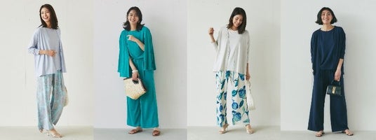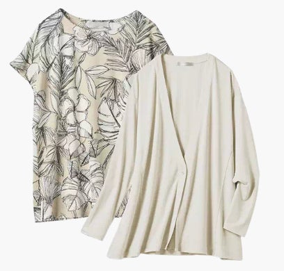 自由に組み合わせて色々なシーンで着回せる、旅に最適なUVスラブ・ジェットセッターズ。今年はカーディガンとフレンチ袖のトップスをセットにしました。無地×無地の2点セットの他、無地カーディガン×柄トップスをセットにした柄2点セットもお選びいただけます。更に、脚のラインや肉感を拾わない筒幅かつ上品に着こなせるセミワイドシルエットのパンツと組み合わせれば好みのセットアップスタイルが完成する優れものです。