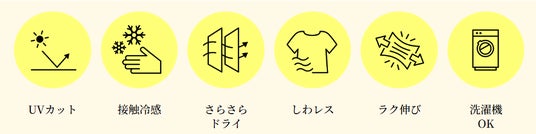 魅力は夏に嬉しい快適な機能性に。ほのかに節が浮かぶ艶やかなストレッチ素材で体型をカバーしながらUVカット効果、ひんやり接触冷感、水に濡れても速乾&シワにならないイージーケアなど真夏も嬉しい高機能が特徴です。