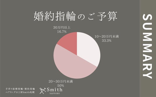 婚約指輪のご予算では、「20~30万円未満」が50%と最も多く、半数のお客様がこの価格帯をお選びになりました。次いで「10~20万円未満」が33.3%、「30万円以上」が16.7%という結果となりました。