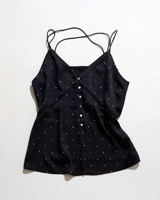 Alphabet Print Camisole程よい光沢が美しいハンマーサテン素材に、アルファベットのプリントを施したVネックのキャミソール。ランダムに配したアルファベットに、さり気ないスターモチーフを混ぜて遊び心をプラス。華奢な2本のストライプをバッククロスしたデザインがポイント。