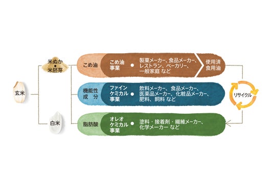 築野グループでは長年、こめ油の原料である「米ぬか」の成分に着目し、研究を進めてまいりました。精米時に発生する副産物である米ぬかの成分を抽出することで、こめ油だけでなく食品、化学、医療、化粧品等の幅広い分野への高度有効利用をし、米ぬかの100%活用を推進しています。今後も国内の米ぬかを活用することで地球・生産者・消費者の良い循環の実現を目指していきたいと考えています。
