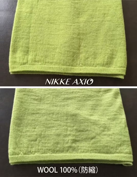 10回洗濯した後の「NIKKE AXIO(R)」と「WOOL 100%(防縮)素材」の比較結果です。