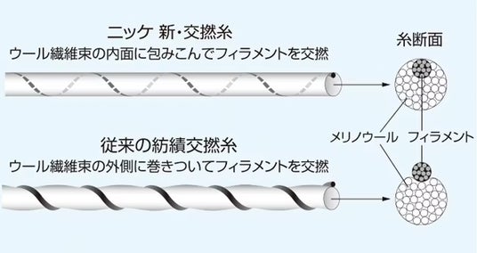 ウールとポリエステルを交撚した糸は世の中にたくさんありますが、AXIO(R)との違いは上図の通り。