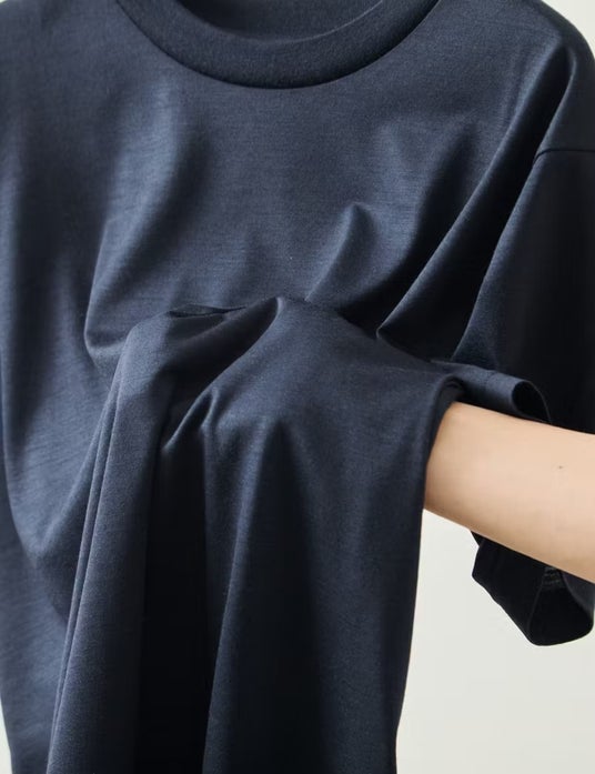 これまでファッションアイテムにはほとんど採用されてこなかったこの素材を、一枚でもジャケットのインナーとしてもサマになるTシャツに仕上げました。
