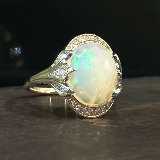 オパールは、見る角度によってさまざまな色がゆらめき、まるで宝石の中に宇宙を閉じ込めたかのような神秘的な輝きが魅力です。その光は日常にさりげない華やぎと彩りを加わえます。
