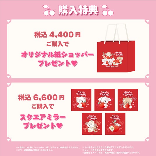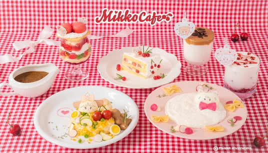 「チェリー」をテーマにしたmikko charactersのムース、キャミ―、ラテ、スフレ、パフ、チューが新規イラストで登場!その場にいるだけで癒される、可愛さで溢れた期間限定カフェを展開いたします。キャラクターをイメージしたフードやデザート、ドリンクはもちろん、カフェオリジナルイラストを使用したカフェ限定のグッズもたくさんご用意いたしました。「Mikko Cafe」で、かわいくておいしいお食事を楽しみながら、特別な時間をお過ごしください。