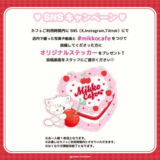 カフェご利用時間内にSNS(X,Instagram,Tiktok)にて店内で撮った写真や動画に「#mikkocafe」をつけて投稿していただいた方に「ステッカー(全1種)」をお1人様につき1枚プレゼント! ※無くなり次第終了
