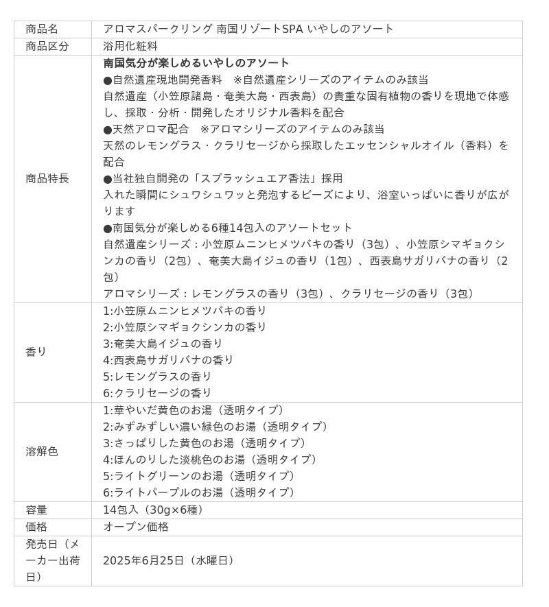 本品は、6種類の香りを詰め合わせたアソートセットです。4種は日本の自然遺産である小笠原諸島・奄美大島・西表島をイメージした香りで構成されており、当社の調香師が実際に現地を訪れ、固有植物の香りを体感・採取・分析して開発したオリジナル香料を配合しています。2種は、天然のレモングラスとクラリセージから採取したエッセンシャルオイル(香料)を配合した上質な香りです。さらに、入浴料の特長として、お湯に入れた瞬間に発泡する「スプラッシュビーズ(R)」(発泡剤)の配合により、香りが瞬時に拡散し、浴室全体に広がります。