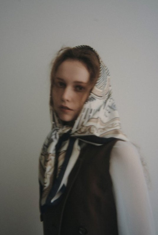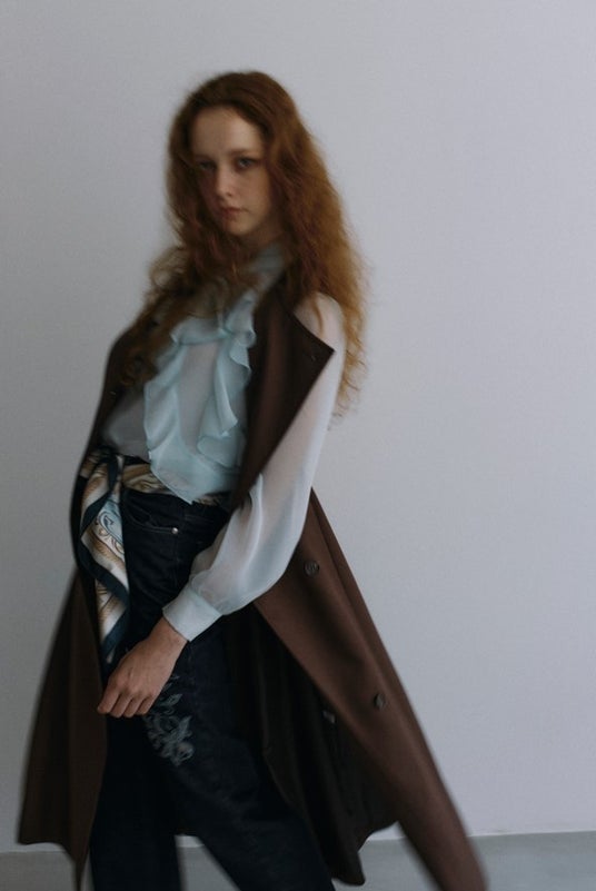 ほどよい透け感が上品な甘めのシフォンブラウスは、デニムやスカーフを合わせて英国を思わせるクラシカルでカジュアルなフェミニンスタイリングに。どこか懐かしい雰囲気を纏いつつもブラウン×ブルーの配色がトレンド感のあふれる仕上が目を引くコーディネート。
