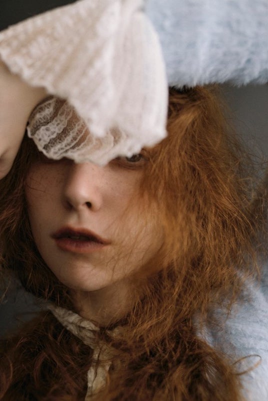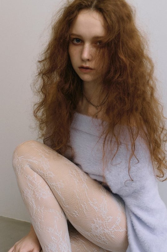 羽に包まれるような心地よさが特徴的なシャギー糸を使用したオフショルダーニットは、レースタイツを合わせてとことん甘めのフェミニンスタイルに。