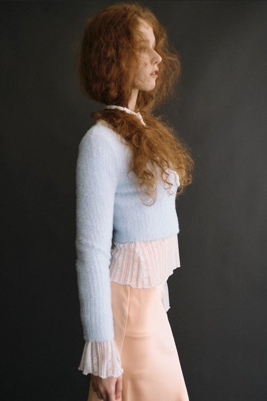 繊細なディティールが目を引くレースカットソーに、アイスブルーのシャギーニットを重ねて奥行きのあるレイヤードスタイルに。柔らかなトーンのシャーベットカラーでまとめることでクラシカルなムードに軽やかで女性らしい印象をプラス。